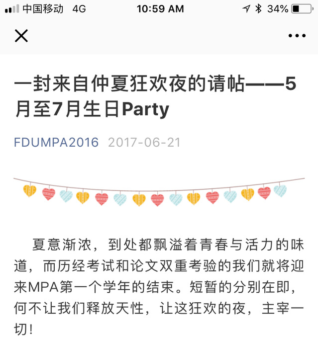 【No1.冬Winter】 太开心辣 | 首次生日趴及年夜饭回顾 ▲蛋糕封面出自我班灵魂画师「一人」同学之手 Timeline 一月6日 18:00 —次日17:00 不到24小时内, 部分同学经历了多达4门考试的折磨, 然而,某些学霸只需要考2门。 你,看到差距了吗? 一月7日 18:00-20:00 同学们嗨森地在旦苑餐厅, 吃吃,喝喝,弥补考试带来的伤害。 然而,有些同学却饱受摧残, 作为1月7日生日的当日寿星公, 必须感受一下来自集体的温暖和善意。 可是寿星公竟然当场呐喊: “为什么选在今天搞活动” “为什么我妈把我生在今天” 妈呀!好惨! —————◆◆◆◆——————— 当日寿星公 本着搞事qing的宗旨 我们又搞了一件大事——生|日|趴 本次生日趴选择了11、12、1月生日的同学,涵盖了天蝎座、射手座、摩羯座、水瓶座。据说这几个星座的特点就是:钟爱冷色调。不信你看,穿得多有默契! 寿星们各自准备了神秘生日礼物 交换礼物的现场出现连连惊喜声 ▲老师们之大家竟然给熊易寒老师下了“大学时单身多年”这一人设,以后上他的课是不准备拿A了喔? 柳妹约我给2016级MPA班级公众号写一段话。最初我的内心是拒绝的:说点好玩的,显得自己轻浮、不稳重;说点正经的,疑似向年轻人兜售自家煮的心灵鸡汤,人家还未必爱喝。不说吧,哎约喂,熊老师真把自己当领导啦,还摆谱! 言归正传,跟大家讲讲我心目中的理想人格,概括成一句话就是:有胆有识有趣。 有胆,不是莽夫之勇,而是即便身处低位,你也有勇气表达自己的观点、态度和立场。有识,不是先见之明,而是对问题有自己的独到见解,即便错了,也包含了片面的深刻。有趣,不是插科打诨,而是用反讽的态度解构荒谬、无知和专横,让日常变得反常。 有胆、有识、有趣的对立面,是懦弱、平庸和无聊。这并不意味着:这个世界有一群有胆、有识、有趣的人,还有一群懦弱、平庸、无聊的人。我想说:懦弱、平庸、无聊是每个人都可能有的一种状态,有胆、有识、有趣则是我们的另一个自我。 不多说了,这的确是一锅鸡汤。 ——熊易寒 ▲张萌萌张平老师(忍不住在此呐喊:张平老师期末考给我A好吗?) 致2016MPA班: 各位同学的到来勾起了刚刚工作两年多的我对学校生活的美好回忆,看到你们的青春热情,我也想去做一次复旦MPA学生!尽管有着繁忙的工作,你们中的很多人依然保持着对学习的热忱和对知识的渴望,在这个极速变迁的时代尤其可贵。新年趴和生日趴的精心策划、活动组织以及那个巨型蛋糕的图案是你们才华的充分展示,你们人才济济,其中还有很多幕后英雄的辛勤汗水。谢谢你们,复旦MPA因你们而精彩!套用一句俗话,今日我以复旦MPA为荣,明日复旦MPA以我为荣! ——张平 ▲另一位张萌萌张洪彩老师 在本班公众号对话框输入: 阿彩最美 获得阿彩老师彩蛋一枚 ▲谢余凤老师--MPAer最热心勤奋No.1人士舍你其谁somanyyears辛苦啦!!!!! ▲大家再熟悉不过的两位重量级助教刘广莉&李亚丁博士 (若干年后的ps最终在全体人民的八卦期盼怂恿中真正的喜结连理~oh我又相信爱情了!!!) “还有谁没来打卡啊? 没签到的过来签到一下!” ——————◆◆◆◆◆◆—————— 很嗨皮の小数据: 本次聚会共有82名同学参与(全班121人*史上最强阵容?),携带了16名家属。中心老师和助教6名。 【No2.春Spring】 如果 | 爱 (依旧自制超萌可爱满分蛋糕思密达) ☞才艺展示 小提琴演奏(徐聪) 主题歌曲《如果爱》(王超) 等等噔噔~~~~ ☞礼物交换 寿星切分蛋糕并互相交换礼物 王子与公主的美梦在这里 七个小矮人和小公主的城堡也在这里 这是MPAer吗,这明明还是满满的童心…… 【No3.夏Summer】 仲夏夜之梦 | let's party 时光很短,欢愉尚浅,绕梁余音,把酒起舞。 这是7月1日仲夏夜之梦生日会留给我们的关键词。 学习很难,考勤很烦,考前很累,感情很真。 如果让我来总结,过去的一年时光里, MPA的生活,是这样。 然而,在一整个四季的陪伴之后,只想大声说一句, 让我们红尘作伴,活得潇潇洒洒吧! 生日蛋糕一如既往→颜值高 主持人一如既往→高颜值 看着上面这些熟悉的照片你是否也会和我一样 感慨时光总是太匆匆? 转眼就已第三学期, 也许过后你会想念我们这个闹哄哄的集体…… 【No4.秋Autumn】 haochi haohe haowan | 最后一次·圆满 本季活动对象8月-10月过生日的同学 (高端大气上档次的奖品) ☞有好吃的 外卖披萨、炸鸡、其他小吃、饮料 创新: 本期寿星可提前或现场招募3-4个好友, 组建智囊团共同参与游戏, 抓紧绑定吧~ ----------------------------------------------------------------------------------------------- 四季轮回,风光荏苒。就这样一起,迈过了两个整年,日日夜夜。 无论冬之温情、春之灿烂,还是夏之劲爽,秋之迤逦,都是一幕幕共同走过,永不复返的时光。 记忆只会越忆越长,心情又会怎样…… 一百21+1张悄然的面孔,最终成长为旦复旦兮·日月光华的模样——收获绵长…… ——2016级MPA秋季班or社会班or本部班 2018.10.26
