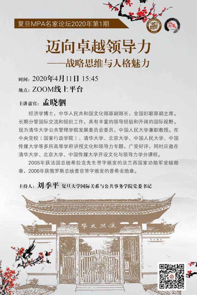复旦MPA项目自2001年设立以来,每年邀请不同学科的著名学者、专家,管理领域的中高层领导,为MPA学生开设30场左右以人文学科为主的名家论坛,旨在开阔学生们的视野,迸发智慧的灵感。 2020年第1期名家论坛讲座将于4月11日(周六)直播归来!,以下小编将带来直播的具体信息!
