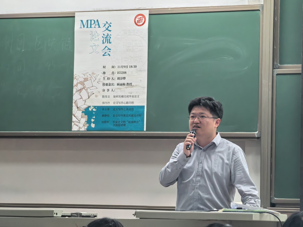 2024年11月9日,复旦大学MPA教育中心成功举办了“国箴”学术交流坊首期活动,本次活动聚焦MPA论文交流。活动邀请到了五位优秀的MPA学长学姐——20级陈佳文、20级田丹丹、21级华玉荣、21级龚静怡和21级周殿军,他们与在场同学们分享了在MPA硕士学位论文写作过程中的宝贵经验和实用技巧。
