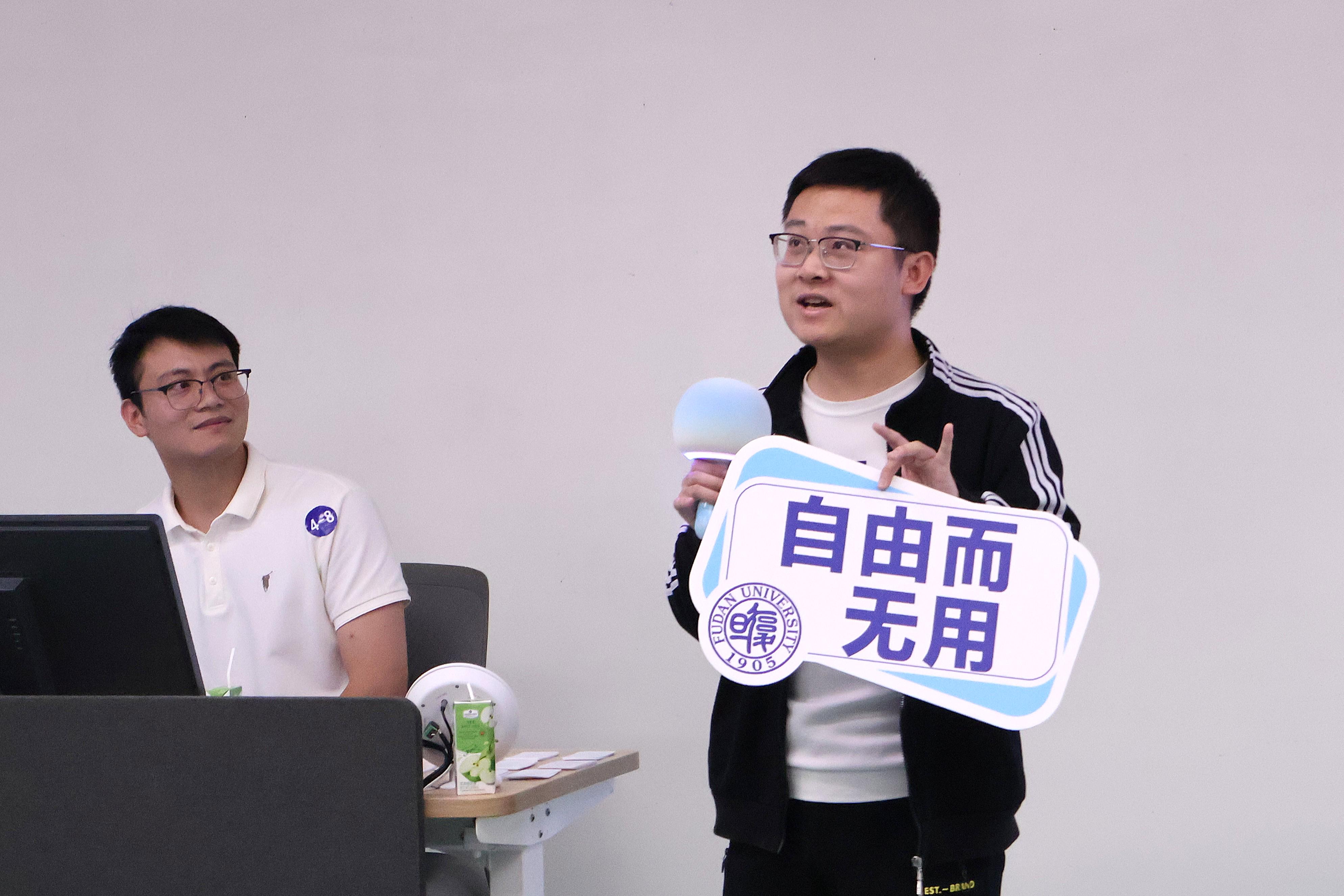 之后,每个组再随机抽出一位同学,来到台前向全班介绍另一位随机抽出的队友。出乎组织者的意料,全部8位同学全部准确复述出队友写下的关键词,以至事先准备的小惩罚沦为泡影。不过这也说明了:一、复旦学子的学习能力很强;二、我们确实互相认识、初步了解了。