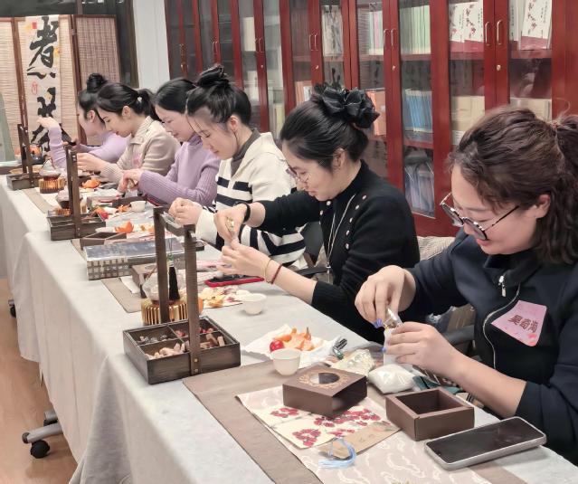 大家围坐在一起,亲手将风干的桂花装入素雅的锦缎小袋中,一针一线仔细缝合。这个简单的手作活动,延续了宋代文人佩戴香囊的风雅传统。桂花清甜的香气与锦缎柔和的质感相得益彰,让每个人都能在动手的过程中放松心情、静心专注。它不仅是一件亲手制作的手工艺品,更是这次茶会的美好纪念——收藏着桂花的香气,也收藏着这个冬日夜晚大家共处的温馨时光。