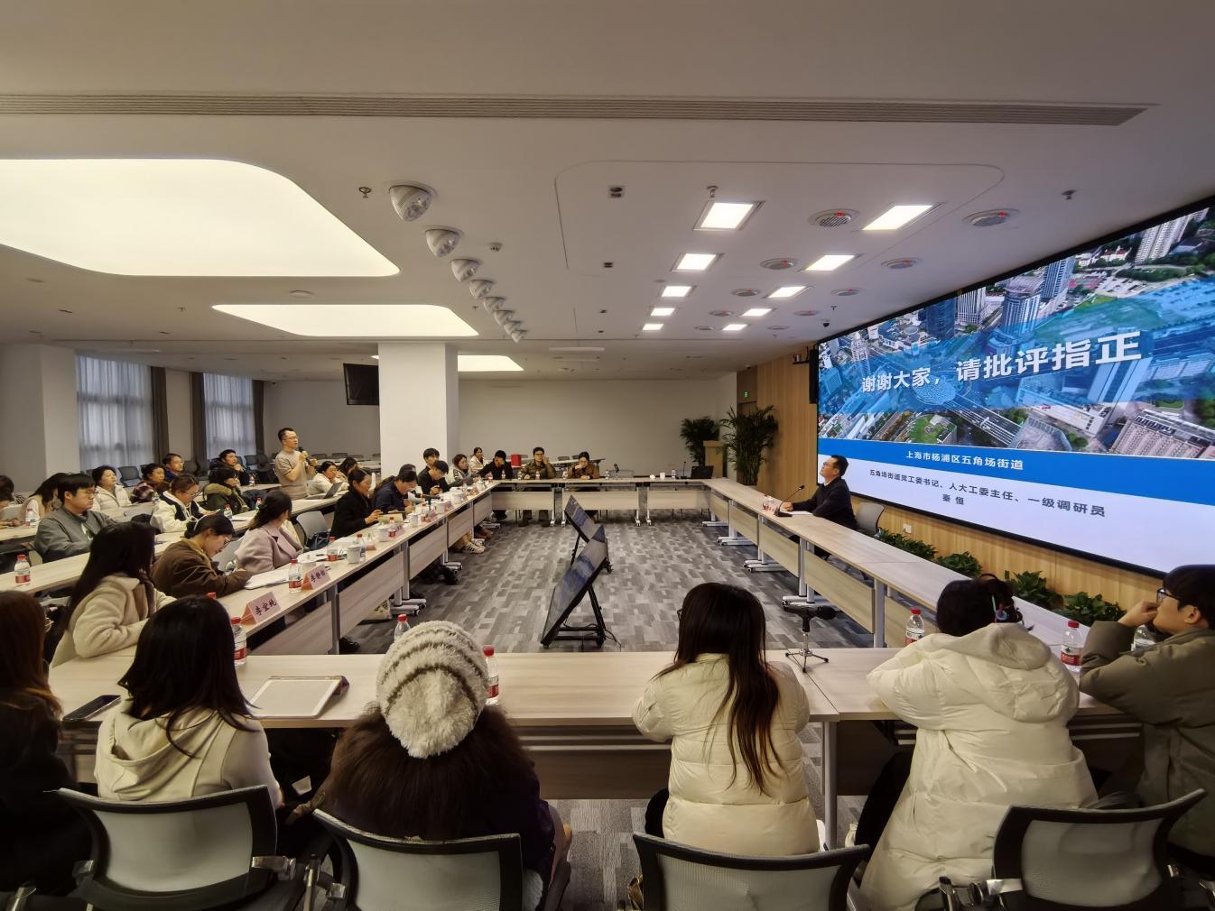 参观考察结束后,师生们与五角场街道党工委书记、人大工委主任秦恒开展座谈交流。秦恒同志围绕杨浦区区情、街道工作内容、基层治理实践三方面展开交流,并结合老旧小区改造、居民楼电梯加装、梦想小院建设、大学路商户透明风挡改造、睦邻门设置等实例,介绍了街道重点难点问题及创新性工作方法,分享了在协调多方资源、回应群众诉求、推进社区共治等方面的实践经验。MPA师生结合自身学习研究方向、实践经历,就社区治理,街道数字化转型历程、现状与平台应用,数字技术应用对基层工作的影响与负担等问题与街道负责人展开深入探讨。现场交流氛围热烈,学生们纷纷表示,通过与基层一线工作者面对面沟通,进一步厘清了理论学习与实践应用的结合点,对基层公共管理的复杂性与创新性有了更深刻的认知。